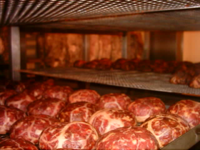 Con orgoglio ci dice che la macelleria è stata fondata a Coredo nel 1850 e fino ad oggi ha collezionato riconoscimenti e premi, puntualizzando che lui lavora ancora a mano i suoi prodotti, macellando e poi lavorando le carni. Ci spiega che la preparazione della Mortandela comincia con il recuperare la materia prima migliore, ovvero i suini pesanti, allevati con alimenti naturali. La carne, dopo la macellazione, viene disossata, sgrassandola, snervandola, macinandola e aggiungendo una miscela di spezie composta da sala, pepe, pimento, cannella, aglio. L’impasto così ottenuto si divide in piccole porzioni di circa due etti. A questo punto le carni non sono insaccate, ma appallottolate ed avvolte nel retino di maiale che ne constraddistingue la forma dagli altri affettati trentini. Vengono adagiate in assi di legno per circa dodici ore, e poi si passa all’affumicatura. Questa operazione dura sei o sette ore e viene fatta in affumicatoi artigianali.