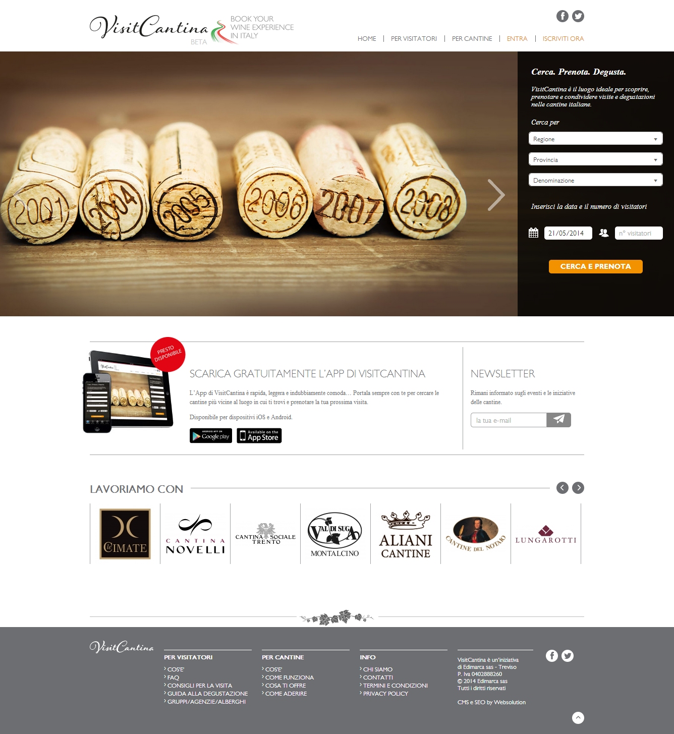 Così come accade per alberghi, voli, acquisti on line e altro, questo portale darà la possibilità di trovare tutte le informazioni per organizzare e prenotare, in pochi clic, il proprio wine tour, partendo da un unico indirizzo e senza dover girovagare tra i siti delle singole aziende. VisitCantina.it non è un semplice elenco di cantine ma una vetrina di percorsi emozionali nel mondo del vino proposti da strutture che fanno dell’accoglienza all’ enoturista un loro punto di forza. Il tutto a portata di pc, di tablet e di smartphone.