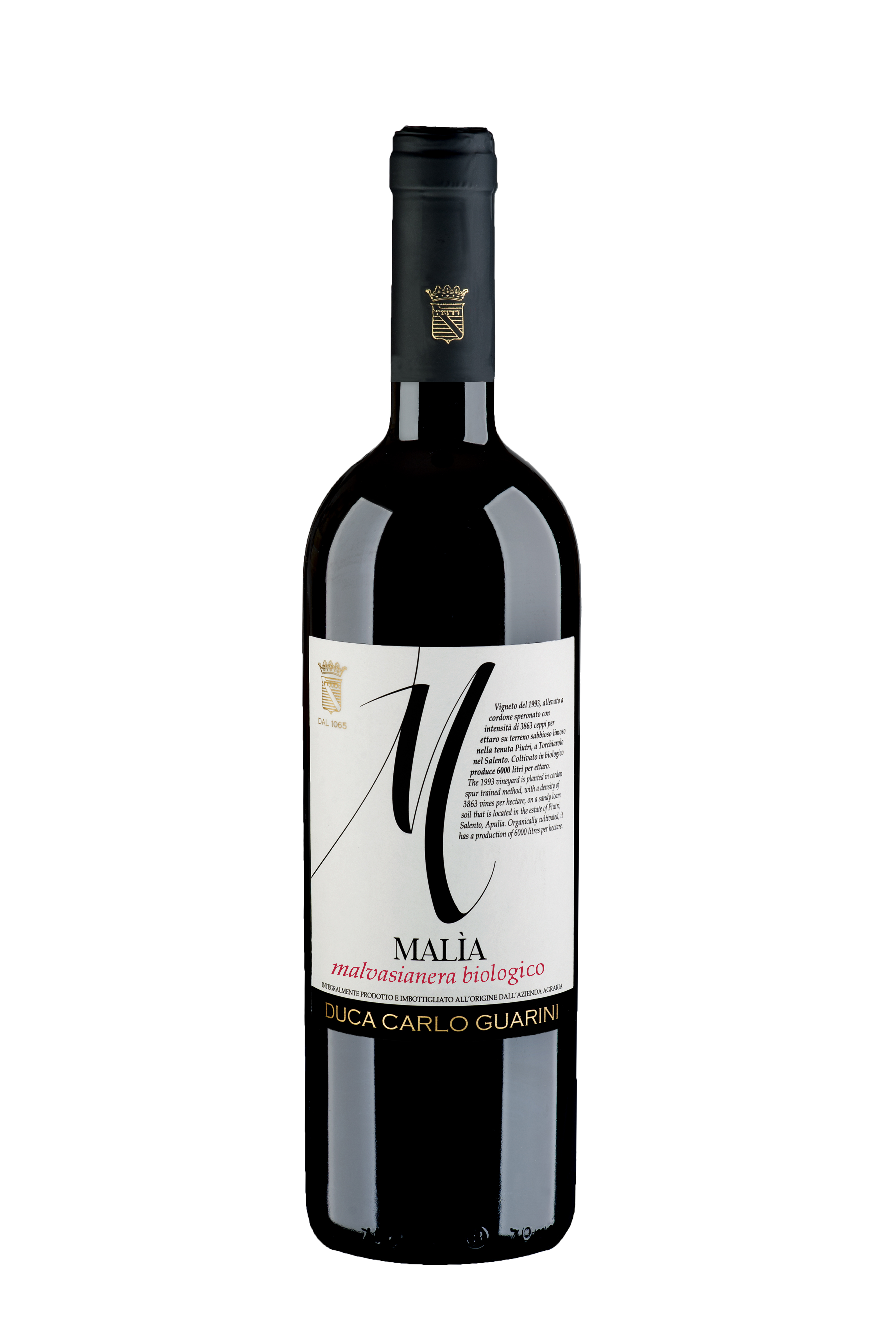 Malìa vuol dire “che ammalia, magia” e, in effetti, è questa la sua capacità sin dai tempi passati. La produzione del Malìa ha origini remote. Già nel 1890 si produceva in Azienda un vino da malvasia nera. Il ritrovamento di alcune bottiglie di quell’antica vendemmia, fece nascere l’idea di impiantare in diversi ettari esclusivamente questo storico vitigno salentino. La tradizione prevedeva il suo consociamento con il più diffuso negroamaro in una percentuale del 20 %, così infatti sono stati disciplinati tutti i vini delle D.O.C. del Salento. La Duca Carlo Guarini fece un primo passo di rottura con la tradizione e dal 2001 iniziò a riproporre, all’attenzione degli appassionati più esigenti e attenti, la malvasia nera in purezza: un vino un tempo destinato solo a pochi fortunati. Dal carattere elegante e sereno, espressione di qualità e tipicità. I vigneti, coltivati a 200 metri dal mare Adriatico, godono dei freschi venti dominanti di nord est e assicurano al Malìa un’incredibile freschezza e una corretta acidità. Il colore è rubino intenso, ma splendente; all’olfatto si apre sui tipici sentori di frutta nera ben matura, liquirizia, terra, accenno di cuoio e di spezie. Di bella densità e lunghezza aromatica, al palato è ricco di sapore, vivace, ben articolato, al tempo stesso fresco di acidità.
