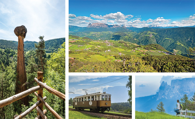 Natura incontaminata, magnifica esposizione, boschi profumati, distese di erba a perdita d’occhio e un’ospitalità autenticamente altoatesina: non stupisce che l’altipiano del Renon sia da molti anni una meta apprezzata da chi cerca vacanze all’insegna del benessere, della semplicità, del relax e dell’attività fisica all’aria aperta, lontano dalla folla. Un piccolo paradiso, per di più a portata di mano: la modernissima Funivia del Renon, con un tracciato mozzafiato di 4.560 metri, impiega meno di dodici minuti per collegare la città di Bolzano a Soprabolzano, uno dei paesi che punteggiano l’altipiano. E una volta arrivati in quota – l’altipiano del Renon ha un’altitudine media di mille metri – ci si può tuffare in questo vero e proprio scrigno di bellezze naturali: uno straordinario “balcone” panoramico con vista sulle vette alpine, particolarmente apprezzabile in primavera, quando i tanti sentieri, le iniziative speciali come “L’alba sul Corno del Renon” (con la deliziosa colazione in quota) e le proposte wellness degli hotel permettono di goderselo al meglio. Tra le mete più apprezzate dagli escursionisti e dalle famiglie, vanno sicuramente citate anche le scenografiche (e antichissime, circa 25mila anni) Piramidi di Terra, curioso fenomeno geologico di materiale morenico, formato dall’erosione conica del terreno. Per osservarle, tre opzioni diverse: nella valletta di Rio Fosco sulla strada per Longomoso e Monte di Mezzo (circa mezz’ora a piedi partendo dalla stazione di Collalbo), e poi ancora nella valletta di Rio Rivellone nei pressi di Soprabolzano e nella valletta di Rio Gasterer ad Auna di Sotto. Incantevoli anche i sentieri per raggiungerle, con punti panoramici e panchine per godersi la vista.