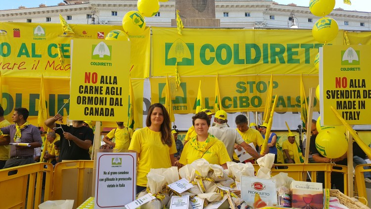 L’iniziativa #stopCETA è condivisa con un’inedita ed importante alleanza con altre organizzazioni Cgil, Arci, Adusbef, Movimento Consumatori, Legambiente, Greenpeace, Slow Food International, Federconsumatori, Acli Terra e Fair Watch) che chiedono di fermare un trattato sbagliato e pericoloso per l’Italia. La svendita dei marchi storici del Made in Italy agroalimentare non è solo un danno sul mercato canadese ma – sottolinea la Coldiretti – è soprattutto un pericoloso precedente nei negoziati con altri Paesi anche emergenti che sono autorizzati cosi a chiedere le stesse concessioni. Per denunciare il pericoloso “cavallo di troia” è stato esposto per la prima volta su un banco della Coldiretti il “maxipacco” dono del falso Made in Italy con le imitazioni delle specialità nazionali piu’ prestigiose, dai formaggi ai salumi, realizzate in Canada che il paese nordamericano sarà di fatto autorizzato a produrre e vendere ai consumatori di tutto il mondo con la ratifica del trattato. Nel cesto della Coldiretti tra i vari prodotti ci sono Asiago, Romano, Montasio, pecorino friulano, romanello, scamorze, Crotonese, Fontina, provoloncino friulano salami, cacciatore salami, veneto salami, mortadella Italia salami, prosciuttino Italia salami, soppressata salami Italia, Siciliano italian style salami, Toscano italian style salami, Napoli italian style salami e San Daniele prosciutto tutti rigorosamente prodotti in Canada. Ma nessun limite è previsto nell’accordo neppure per i wine kit che promettono di produrre in poche settimane le etichette piu’ prestigiose dei vini italiani, dal Chianti al Valpolicella, dal Barolo al Verdicchio che il Canada produce ed esporta in grandi quantità in tutto il mondo