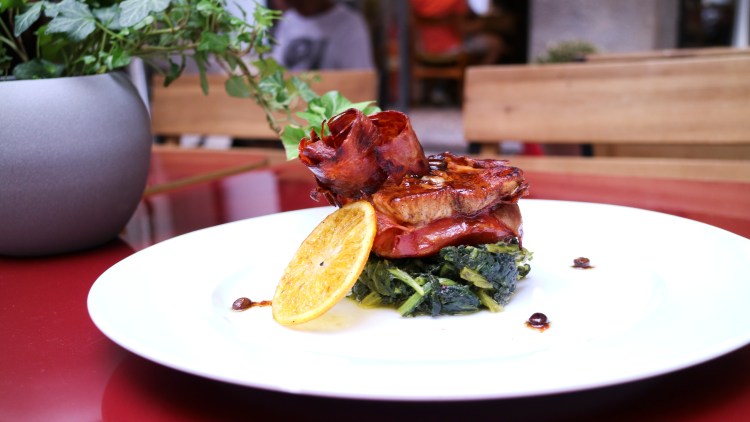 Rosolare la carne con dei chicchi di caffè, aglio e una noce di burro in padella su ambo i lati. Sfumarlo con un caffè espresso, un cucchiaio di succo di arancia e uno di acqua, coprire e lasciare cuocere a fuoco basso per 7 minuti. A parte saltare le bietoline fresche con uno spicchio di aglio, un filo di olio e due cucchiai di succo di arancia.
