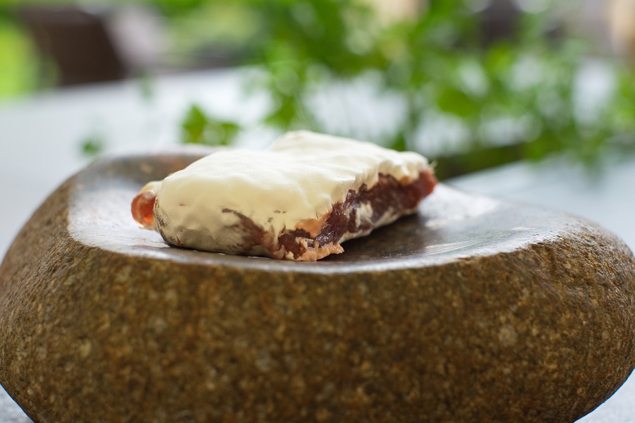 Giuliano Baldessari, chef del ristorante Aqua Crua a Barbarano Vicentino (Vicenza), ama trasgredire e sperimentare in cucina. Una trasgressione, la sua, che non è fine a se stessa, ma è un modo per superare i propri limiti, sovvertendo i canoni di cucina imposti dall’attitudine personale, fino quasi a trasformarsi in un altro io. L’ultimo piatto nato nella cucina di Aqua Crua è La Muffa, un controfiletto di fassona piemontese, da allevamento biologico del Consorzio La Granda, che viene marinato con un’iniezione di Penicillium Candidum, una muffa bianca usata spesso per produrre formaggi, e lasciato ammuffire alla temperatura controllata di 20° per tre, quattro settimane. Il fungo agisce abbassando drasticamente il ph della carne, tutelandola dall’aggressione di microrganismi patogeni e donando al controfiletto un sapore simile alla crosta del formaggio brie. Un’operazione che trasgredisce al consueto modo di valorizzare una carne di primissima qualità che viene normalmente servita freschissima, ma attenta alla sua conservazione e soprattutto al gusto, che rimane il punto focale della cucina di Giuliano Baldessari.