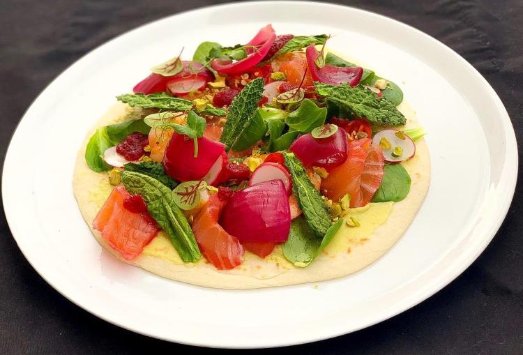 “Piadizza” con guacamole, salmone marinato alla barbabietola, chips di cavolo nero, gamberi viola mi-cuit, granella di pistacchi e olio di gamberi.