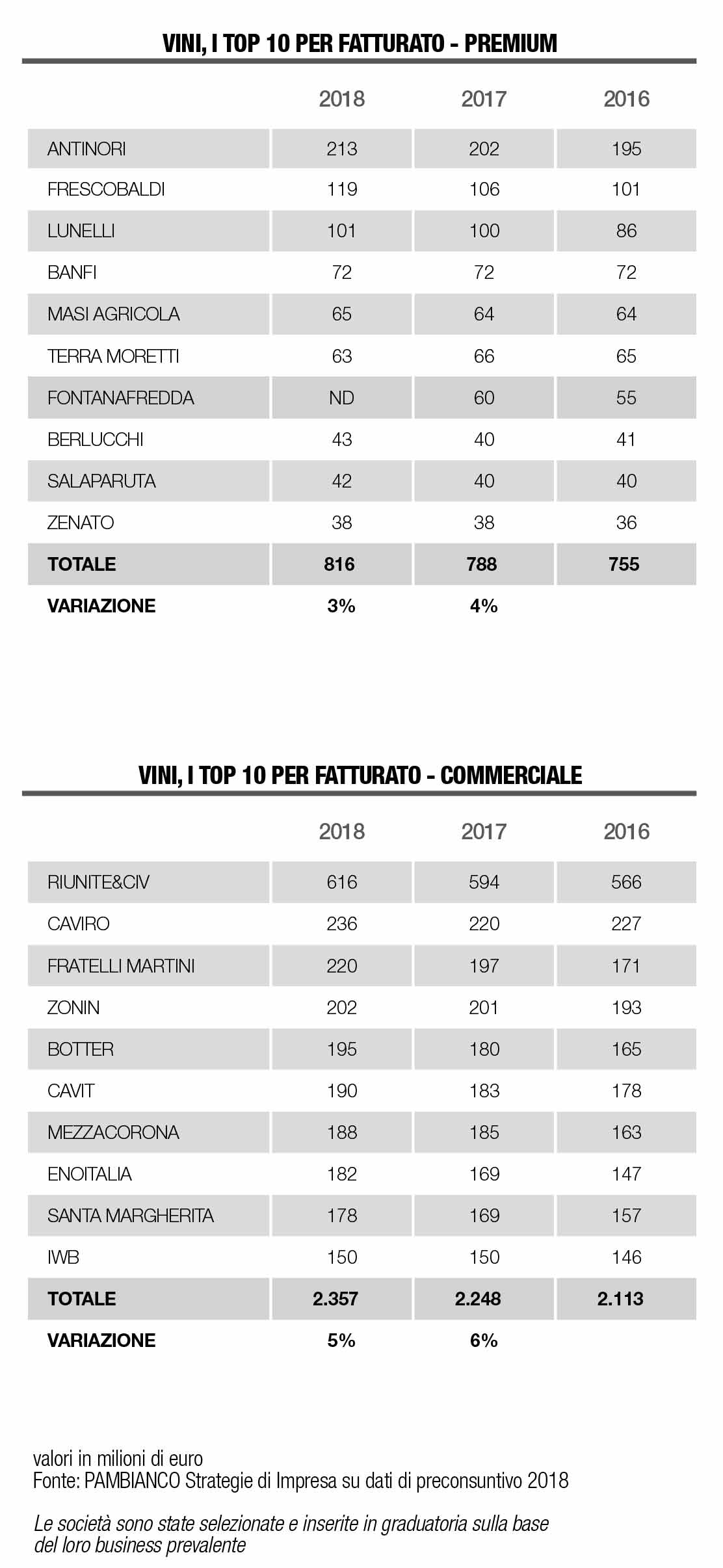 Nella fascia alta, il differenziale dipende dai risultati di Antinori, primo con 213 milioni (+5%), e di Frescobaldi, secondo con 119 milioni (+13%). Tra gli inseguitori, è stato soprattutto un anno dedicato ai cambiamenti interni e con andamenti per lo più in linea con l’esercizio precedente. Anche nell’ambito commerciale la corsa è leggermente rallentata, con un +5% nel 2018 contro il +6% dell’esercizio precedente, ma i valori in questo caso sono diversi: la top ten delle società cosiddette commerciali vale complessivamente 2,35 miliardi di euro e la più piccola di queste realtà fattura ben 150 milioni.Osservando la top ten della fascia commerciale, appare evidente che tutti i gruppi sono in crescita, con la sola eccezione di Iwb che comunque conferma i valori del 2017. Tra i risultati più significativi compaiono quelli di Botter, che guadagna 15 milioni di euro, e di Enoitalia, che sale di 13 milioni, principalmente grazie al contributo del Regno Unito dove l’azienda veneta controlla una quota del 20% del vino venduto ontrade e in buona parte si tratta di Prosecco. Oggi la quota di produzione legata alla spumantistica per Enoitalia è pari al 40% e proprio per gestire il business dello spumante è stato realizzato il nuovo stabilimento di Montebello Vicentino. Da evidenziare, infine, il risultato di Gruppo Santa Margherita, che non può essere considerato una vera propria realtà commerciale poiché al suo interno convivono una parte ampia di prodotti accessibili (dal Pinot grigio al Prosecco), grazie ai quali la società del gruppo Marzotto ha conquistato i suoi mercati di riferimento a cominciare dagli Stati Uniti, e una altrettanto importante di fascia alta e fortemente remunerativa. Il 2018 si è chiuso con un balzo di oltre il 5% a 177,5 milioni di euro.