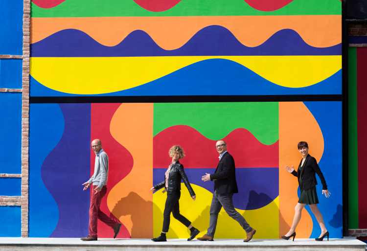 La scintilla creativa è scaturita all’improvviso davanti a un bicchiere di Barolo e alla maestosità del paesaggio. Agli artisti è subito piaciuta l’idea di recuperare l’edificio in rovina in una divisione spontanea degli interventi: all’esterno forme geometriche in colori acidi e forti disegnate dall’americano Sol LeWitt, maestro dell’arte concettuale; all’interno grandi campiture in tinte morbide, stese con il palmo della mano dall’inglese David Tremlett, anche autore dei riflessi acquei del pavimento marmoreo.