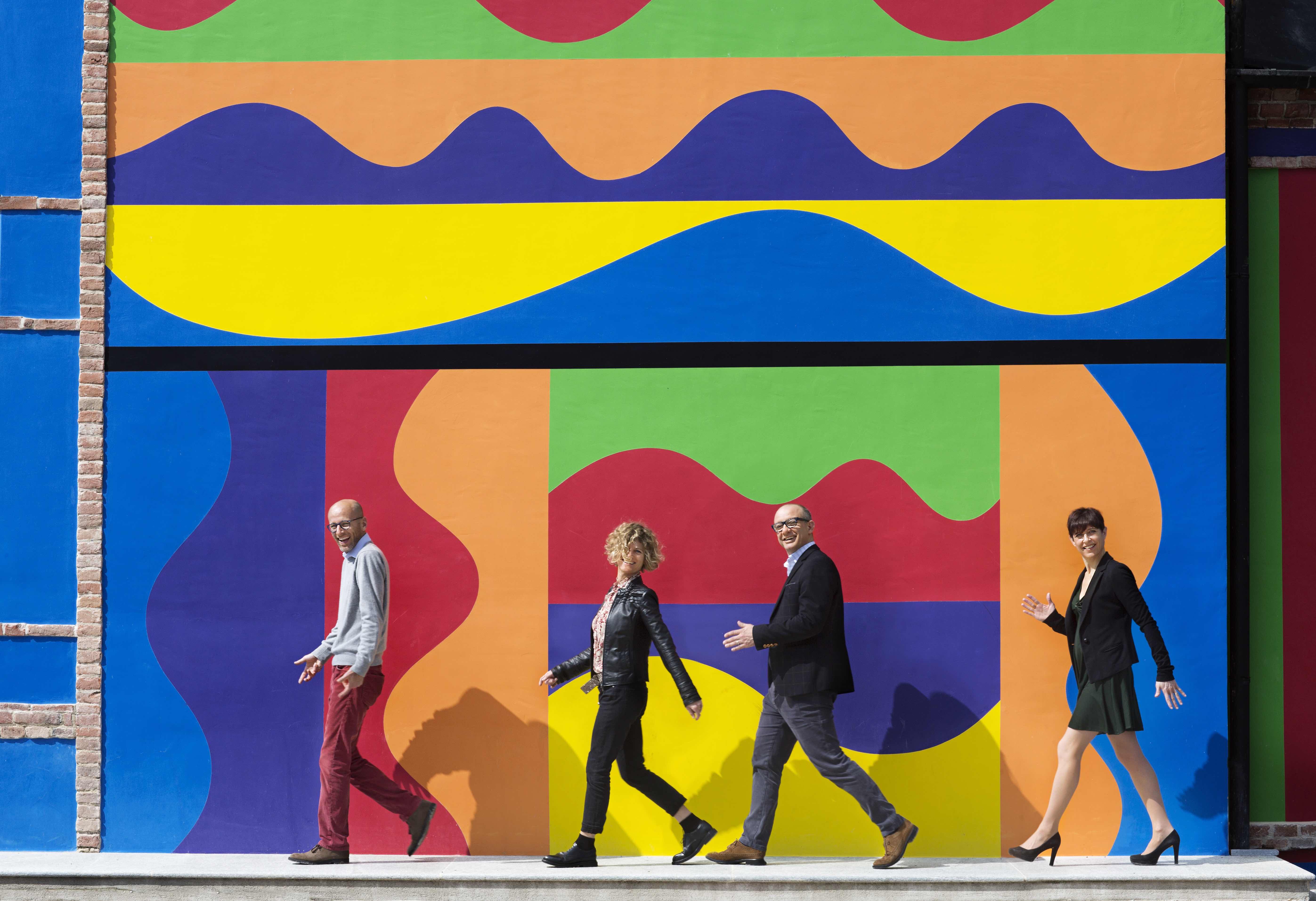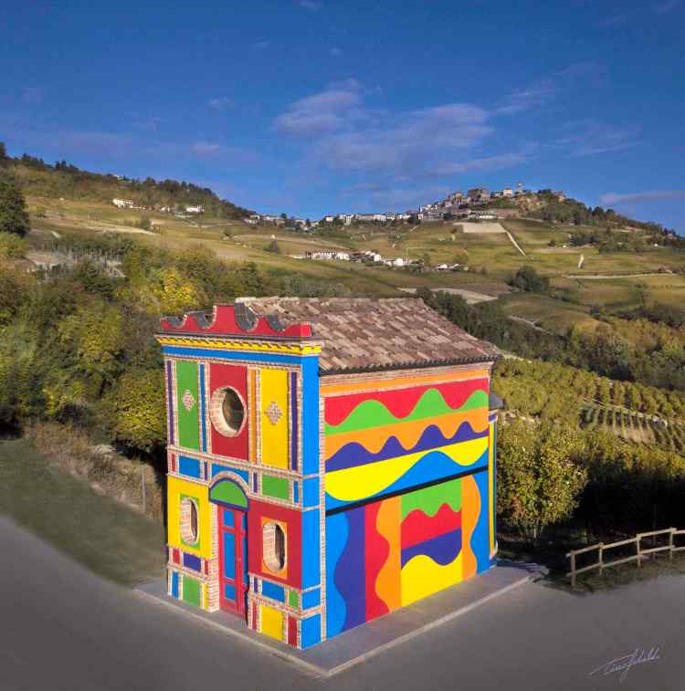 La scintilla creativa è scaturita all’improvviso davanti a un bicchiere di Barolo e alla maestosità del paesaggio. Agli artisti è subito piaciuta l’idea di recuperare l’edificio in rovina in una divisione spontanea degli interventi: all’esterno forme geometriche in colori acidi e forti disegnate dall’americano Sol LeWitt, maestro dell’arte concettuale; all’interno grandi campiture in tinte morbide, stese con il palmo della mano dall’inglese David Tremlett, anche autore dei riflessi acquei del pavimento marmoreo.