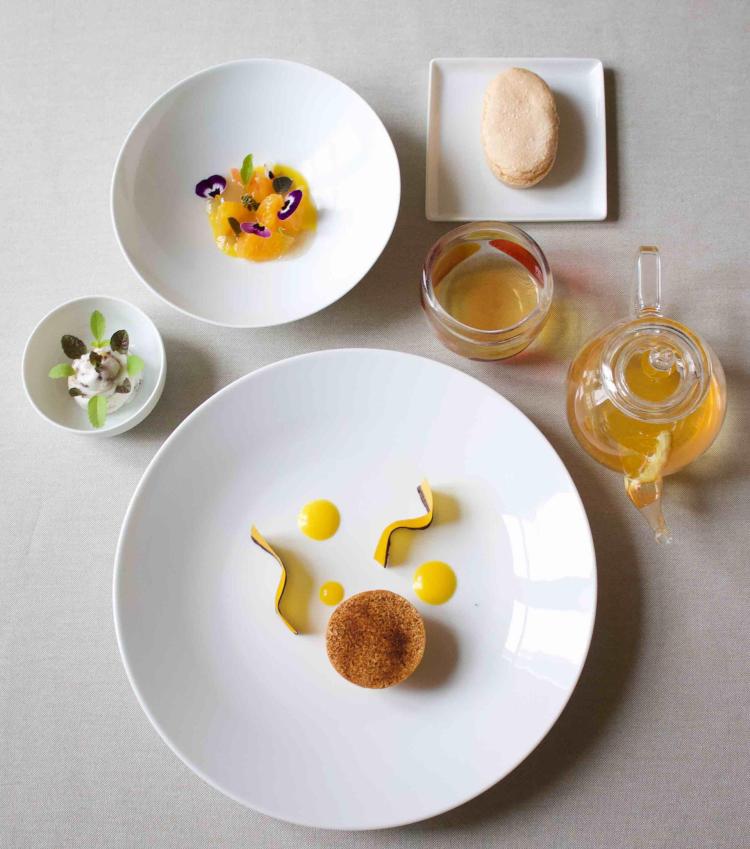 Nel piatto principale un gioco di geometrie rivela un guscio croccante ricavato dalla polpa dell’arancia che viene farcito con la spuma di mandorla. Caffè, mango verde e polvere di limone bruciato accentuano le note mediterranee del dessert aprendo il palato a un vero viaggio di sapori e atmosfere. Infine la salsa di arancia e le finte scorzette passate nel cioccolato fondente completano l’armonia del piatto. Il brodo di arancia, preparato con le bucce tostate, aggiunge una nota energica alla composizione.