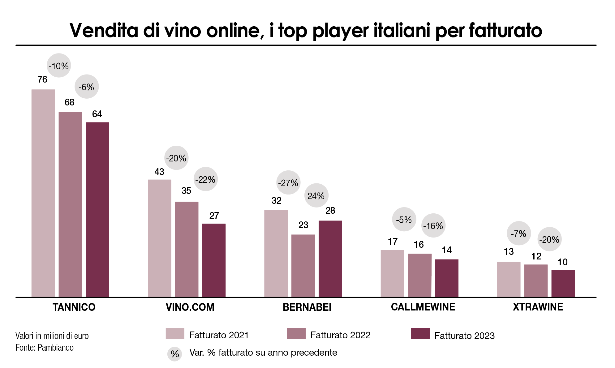 Analizzando le performance dei principali player italiani, emergono differenze significative: Tannico, leader del settore, ha registrato un calo del 6% chiudendo l’anno con un fatturato globale di 64 milioni di euro, mentre Vino.com ha subito una contrazione del 22%, raggiungendo i 27 milioni. Anche Callmewine ha chiuso il 2023 in negativo, riportando una flessione del 16% e totalizzando 14 milioni di euro, e Xtrawine, nonostante un ampio assortimento di oltre diecimila etichette, non ha superato i 10 milioni, registrando un calo del 20%.
